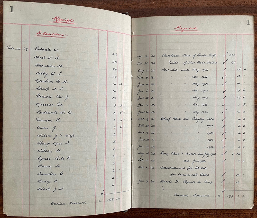 The Thurlow Croft was available for sale, and a decision was taken to purchase it for use as a recreation ground. Subscriptions opened to raise the funds for the purchase on 24 December 1919, and by the end of February 1920 sufficient funds were in hand to allow the purchase to be completed. The Thurlow Croft was bought for £500 by twenty Trustees on 8 April 1920 to hold as a public recreation ground “as a perpetual memorial to the men of Epworth who fell in The Great European War (1914 to 1918)”. There were 145 donations by individuals, ranging from £42 to 10 pence. In addition, the ex-Soldiers and Sailors raised £100, the Working Women’s Association contributed £47.11, the Epworth Belgian Fund £24.34, a Garden Fete raised £40, a concert raised £17.50, £8.65 was collected at the Peace Celebrations and £2 at a Welcome Home Tea, and there were donations from the Agricultural Show of £30.12, the Cricket Club of £19 and the Town Lighting Committee of £2.36. Clearly it was a community wide effort. The total raised enabled the Trustees also to acquire in December 1922 part of an adjoining orchard for £90 to add to the land available.