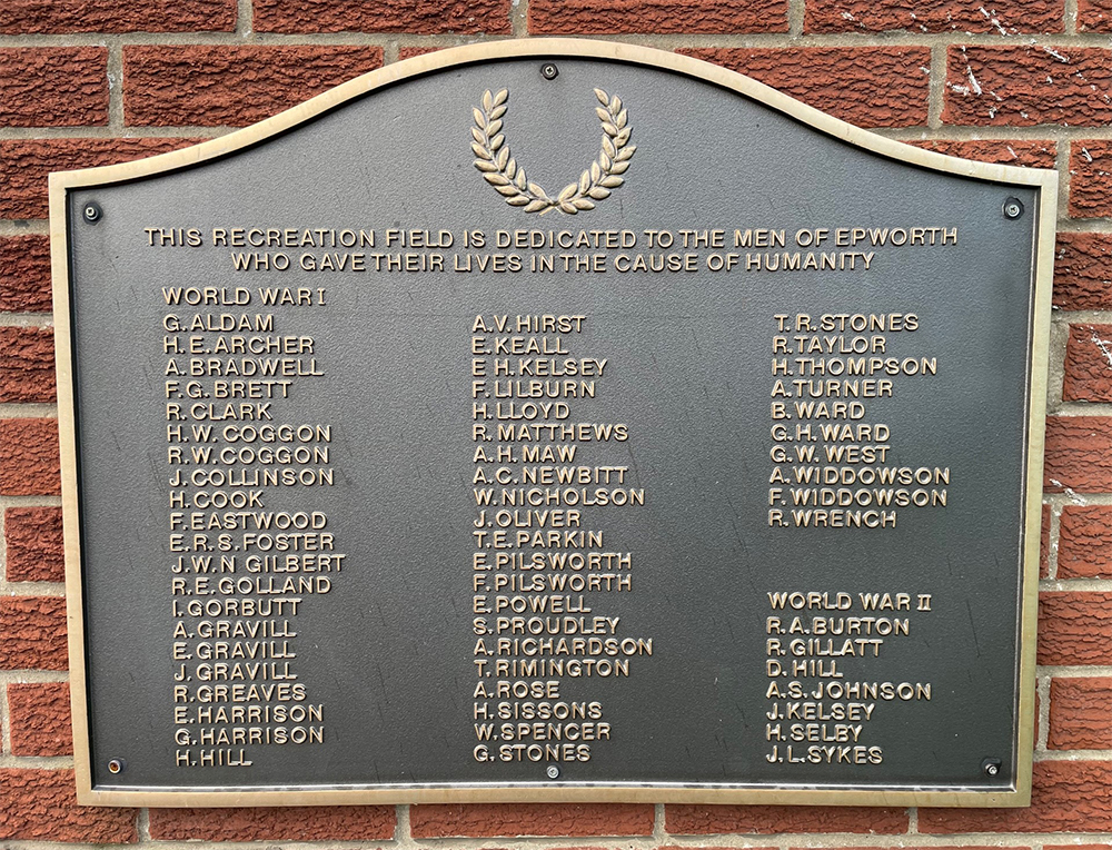 For more than a hundred years now the Epworth War Memorial Field has been held as a memorial to those Epworth people who lost their lives in the First World War. It is now dedicated equally to those who fell in the Second World War. The names of those remembered are set out in a plaque on the wall of the pavilion which was unveiled on 2 August 2014, the centenary of the outbreak of the First World War. The Field has been maintained by people from the local community who have acted without payment, and have employed local people and companies wherever possible to carry out necessary work at the Field.
